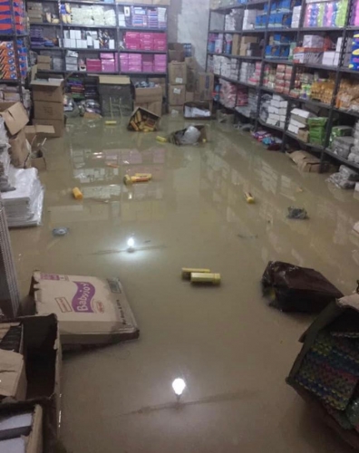 وتسببت مياه الامطار والتجمعات المائية التي تحولت الى فيضان داهم المحال التجارية بخسائر فادحة للتجار تقدر بمئات الالف.