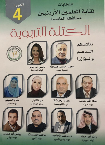 وتضم الكتلة المرشحين والمرشحات محمد خميس عبد الل ــ قصبة عمان ، نانسي ابو جابر ــ لواء الجامعة ، عطا الله مقابلة ــ لوار ماركا ، عماد الحواتمة ــ لواء القويسمة ، مها الفايز ــ مركز الوزارة ، سهام العفيفي ــ لواء سحاب ، رائد ابو حماد ــ لواء الجيزة ، د . محمد المحاميد ــ لواء وادي السير ، عاكف العفيشات ــ لواء ناعور ـ، رياض ابو غليون ــ لواء الموقر . وفيما يلي البيان الانتخابي :