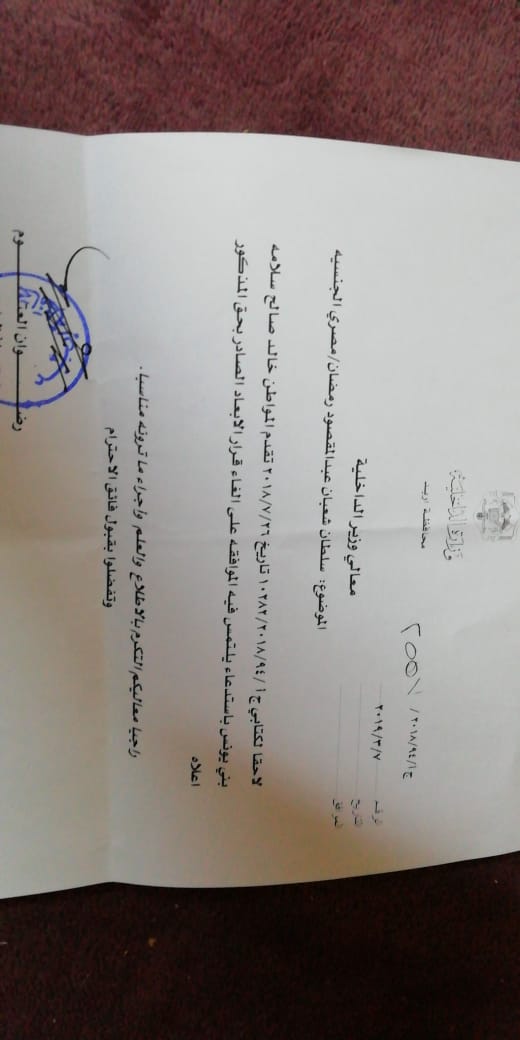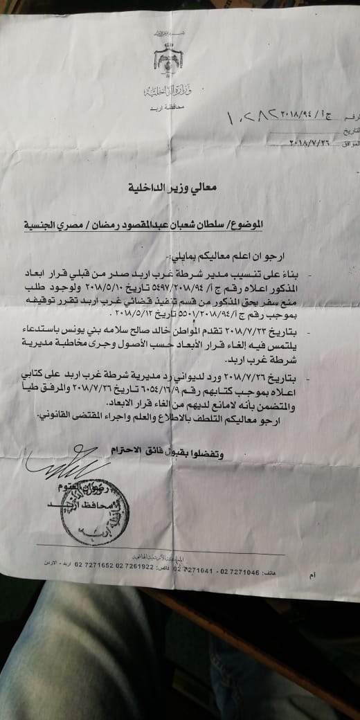 واشار الى ان صاحب العمل راجع محافظ اربد لالغاء قرار الابعاد الا ان المحافظ ابلغه بان القرار في يد الوزير شخصياً ولا يستطيع اتخاذ اي قرار بهذا الخصوص.