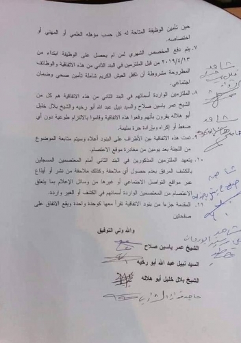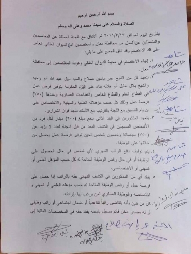 البيان الذي نشرته اللجنة الممثلة عن المعتصمين والمتعطلين عن العمل من محافظة معان امام الديوان الملكي العامر والذي اكد على ان انهاء الاعتصام جاء بتعهد من قبل بعض شيوخ المحافظة بدفع 200 دينار لكل فرد من الاشخاص المسجلين في الكشف المعد من قبل اللجنة لعدد لا يزيد عن 750 شخص لحين توفير فرصة عمل يحصل من خلالها على وظيفة..