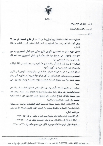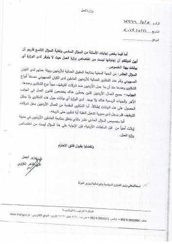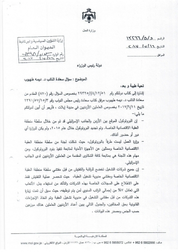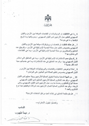 وأكدت طهبوب أن تشغيل الأردنيين لدى العدو الصهيوني يمثل قنبلة موقوتة يمكن للعدو استثمارها ضد الأردن في أي لحظة، وأن ما أعلن مؤخرا عن توظيف ( 500 ) مواطن أردني كعمال جدد لدى الكيان الصهيوني، إضافة الى وجود ( 1500 ) عامل أردني يشكل تماهيا مع خطط الصهيانة في ربط اقتصاد الوطن به، والسيطرة عليه، والتأثير على الداخل الأردني بشكل مباشر، وأن الرد الحكومي على سؤال نيابي وجهته بخصوص العمالة الأردنية لدى الكيان الصهيوني يكتنفه الغموض بخصوص تعرض هؤلاء العمال لانتهاكات عمالية واستغلال لأوضاعهم، كما أن المهن التي يعملون بها متوفرة في الأردن عموما، وفي العقبة على وجه الخصوص، الأمر الذي يطرح تساؤلا وجيها عن خطط الحكومة لتوفير فرص عمل كريمة للأردنيين في وطنهم وبأجور تفي بمتطلبات حياتهم.