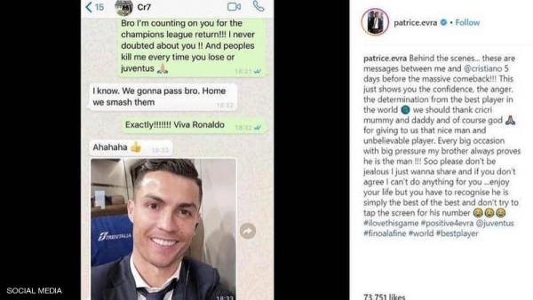 وكتب إيفرا الذي تزامل مع رونالدو لسنوات في مانشستر يونايتد الإنجليزي، على حسابه بموقع "إنستغرام": "صورة خلف الكواليس للرسائل بيني وبينكريستيانوقبل 5 أيام من "العودة العظيمة" (عودة يوفنتوس من الهزيمة 0-2 ذهابا وانتصاره 3-0 في الإياب).