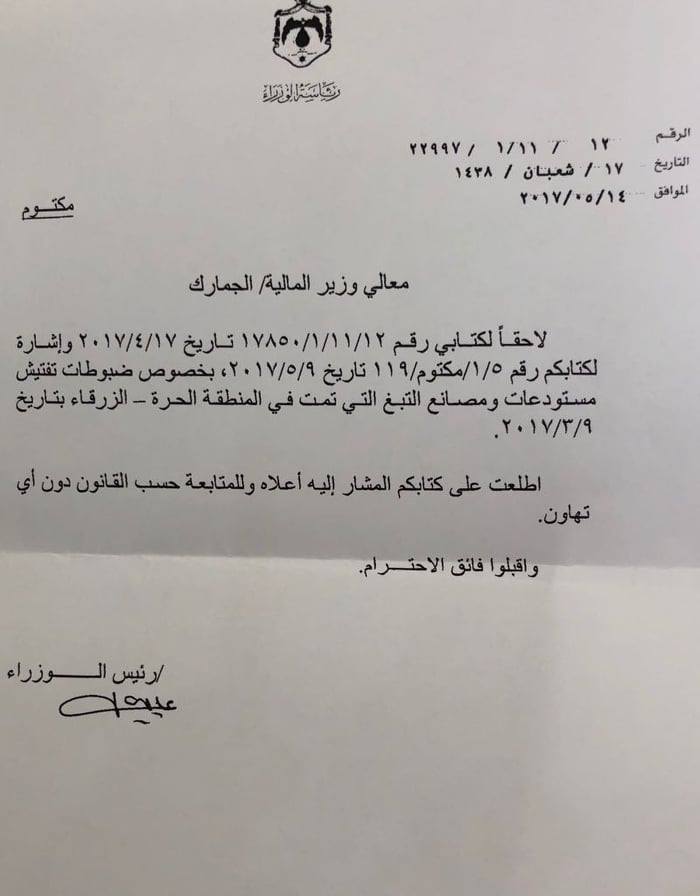 وأكد العلاونة أن موكله لم يزر بيروت منذ عام 2005 ووفقا لصور جوازات السفر الخاصة بموكله والتي تم تزويد سعادة المدعي العام بها وان ما أورده المشتكى عليه محض افتراءات لا تصمد أمام الحقيقة مشيرا إلى أن موكله إبان كان رئيسا للوزراء هو من أوعز لوزير المالية حرفيا "بتطبيق القانون دون تهاون " فور علمه بقضية الدخان وكما هو مثبت ايضا بالوثائق.