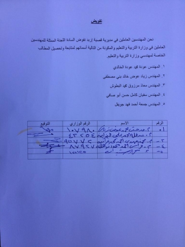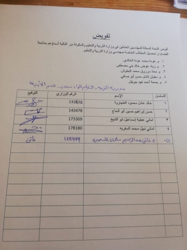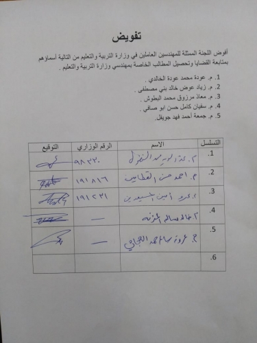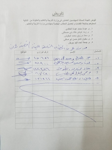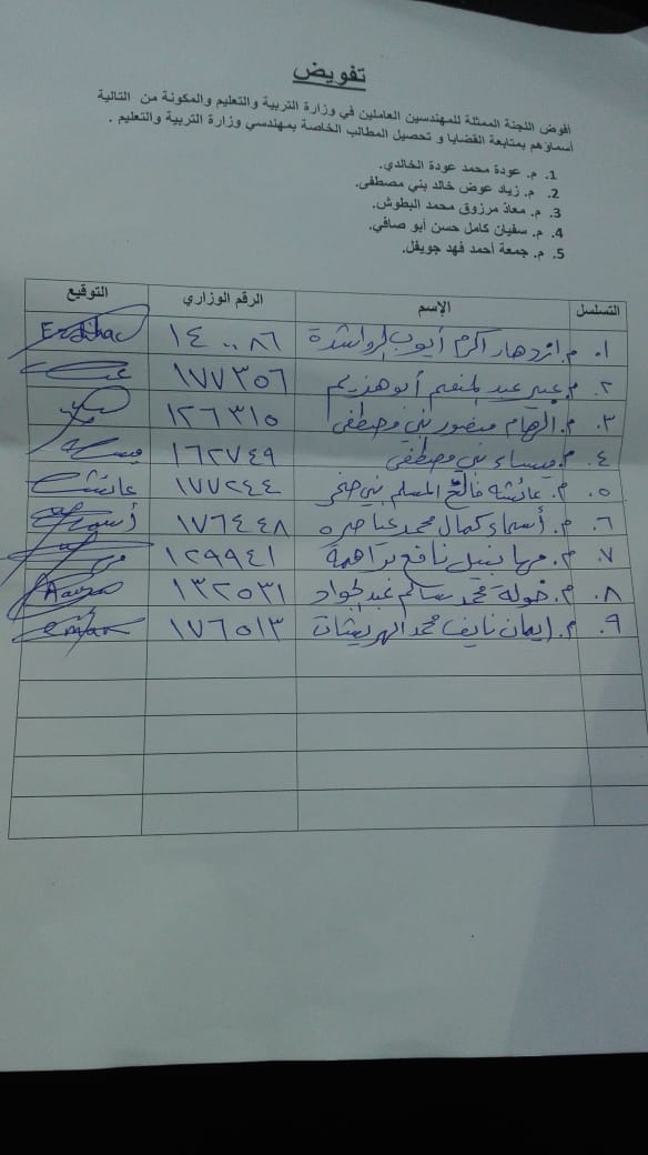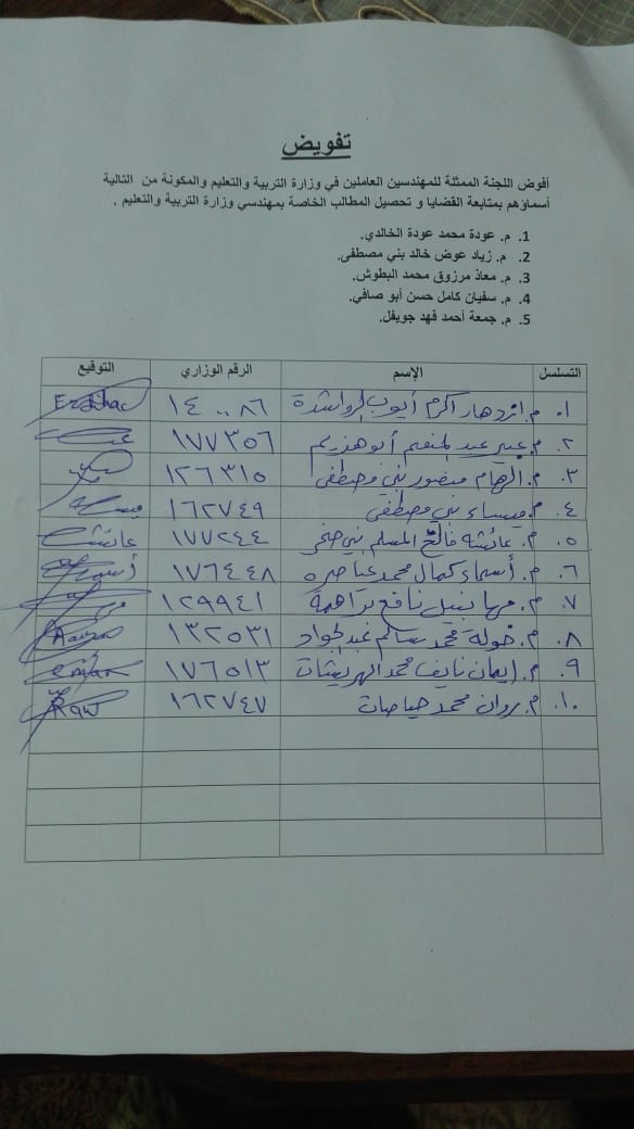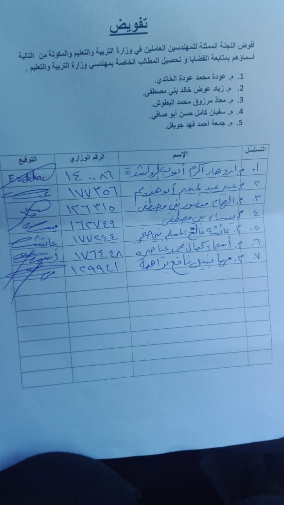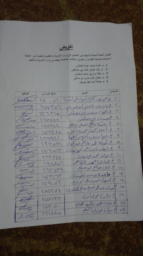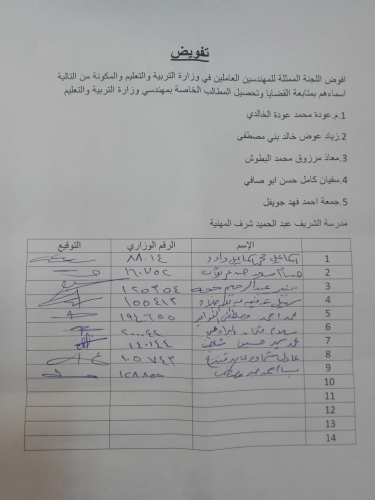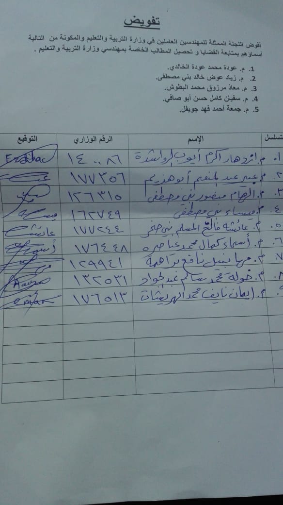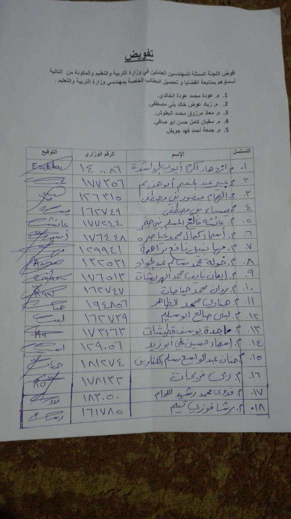 ووقع عدد كبير من المهندسين على تفويض للجنة الممثلة للمهندسين العاملين في التربية لمتابعة قضاياهم وتحصيل حقوقهم ومطالبهم.