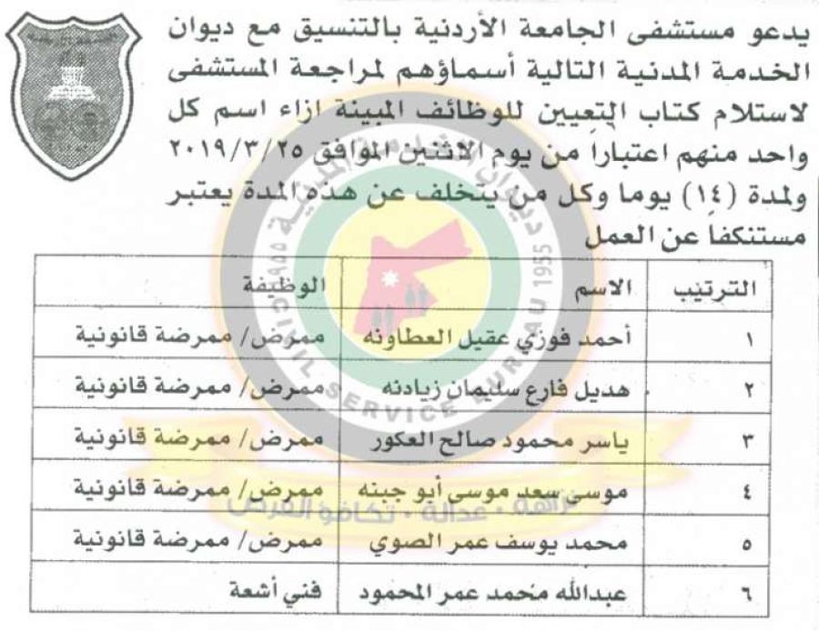 يدعو ديوان الخدمة المدنية بالتنسيق مع وزارة الشؤون البلدية (بلدية بيرين الجديدة)، ووزارة الصحة، ووزارة العمل، ومؤسسة الاقراض الزراعي، ودائرة قاضي القضاة،التالية أسماؤهم التواجد الخميس الموافق 28/3/2019، الساعة 12 ظهرا في مبنى ديوان الخدمة المدنية الكائن في طبربور/ شارع الأقصى، لحضور الامتحان التنافسي الالكتروني.