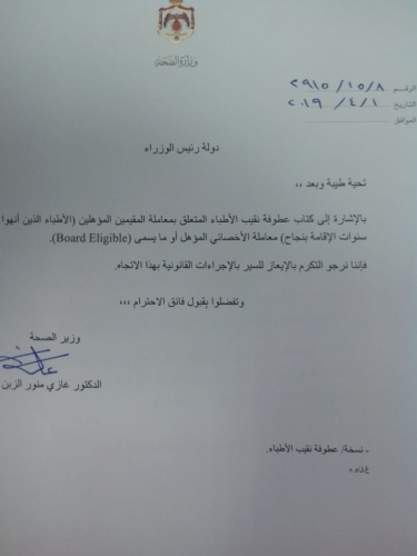 اخيراً وليس آخراً حَلت وزارة الصحة بالتعاون مع نقابة الأطباء عقدة من عقد الأطباء الاردنيين العاملين في القطاع الحكومي بعد أن تم منح الأطباء الذين انهو مدة الإقامة بنجاح مسمى " طبيب اخصائي مؤهل " بشكل رسمي والايعاز بالتطبيق ليستطيع حفظ حقوقه والعمل كمختص بدلاً من بقاءه طبيب عام في وزارة الصحة بالرغم من عمله داخل المستشفيات كطبيب مختص