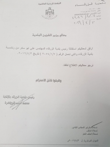 ابو السكر يستقيل رسميا من رئاسة بلدية الزرقاء