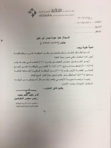 ولفتت الى ان المنطقة التي تقع فيها قطعة الارض لم تصلها الخدمات للان وليست في مناطق العقبة الراقية.