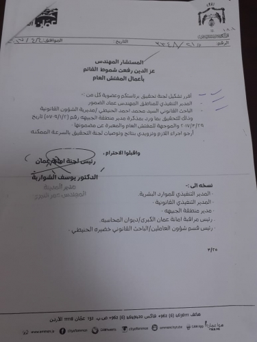 وبين شموط لـ اخبار البلد أنه بعد استكمال التحقيقات من اللجنة مع الموظفين المعنيين بالقضية تم اثبات مبدئي بوجود حالة غير صحيحة وإجراءات مثيرة للشبهة ، مما استدعى لجنة تحقيق الامانة وبموافقة امين عمان لتحويل القضية برمتها الى هيئة النزاهة ومكافحة الفساد بتاريخ 11/7/2017 ولوجود أطراف من خارج كوادر الامانة مستفيده من هذه الكتب غير الصحيحة