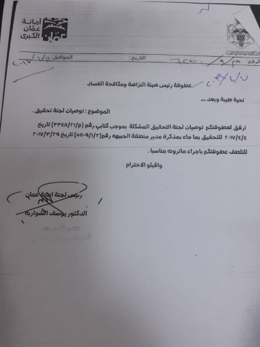 وأشاد المفتش العام في أمانة عمان المهندس عزالدين شموط بالتعاون بين الأمانة والهيئة لمكافحة الفساد بكافة أشكاله.. ولفت الى أن أمين عمان الدكتور يوسف الشواربة كان قرر بتاريخ 4/4/2017 تشكيل لجنة تحقيق داخلية برئاسة المفتش العام للكشف وتقصي الحقائق عن كتب موجهة من الأمانة لدائرة الاراضي وإصدار أذونات أشغال يشوبها عيوب قانونية.