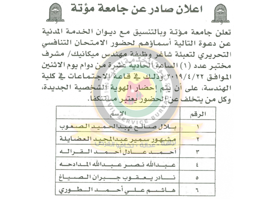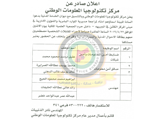 دعا ديوان الخدمة المدنية بالتعاون مع مختلف الوزارات و المؤسسات الحكومية، التالية اسماؤهم لاجراء المقابلات الشخصية لغايات التعيين.