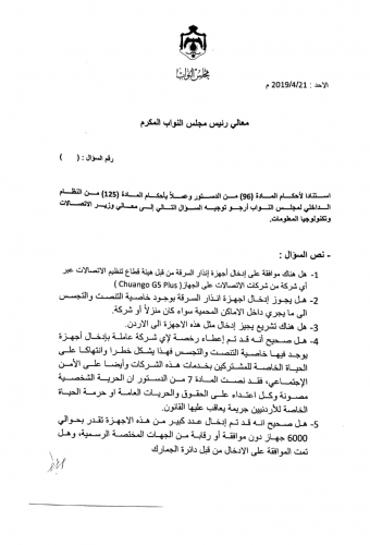 4-هل صحيح أنه قد تم إعطاء رخصة لإي شركة عاملة بإدخال أجهزة يوجد فيها خاصية التنصت والتجسس فهذا يشكل خطرا وانتهاكا على الحياة الخاصة للمشتركين بخدمات هذه الشركات وأيضا على الأمن الإجتماعي، فقد نصت المادة 7 من الدستور ان الحرية الشخصية مصونة وكل اعتداء على الحقوق والحريات العامة او حرمة الحياة الخاصة للأردنيين جريمة يعاقب عليها القانون.