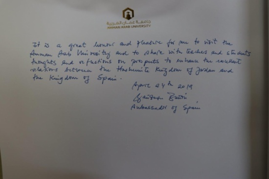 بدوره عرض رئيس مجلس أمناء الجامعة الدكتور عمر الجازي لعمق العلاقات الأردنية الإسبانية وجهودهما في الحفاظ على السلام والامن الدوليين من خلال إشاعة التسامح والتعددية، مبينا لأهمية الدور الاوروبي في دعم عملية السلام ودعم دول المنطقة ومنها الأردن التي ترتبط بعلاقات قديمة وعميقة بين الشعبين الأردني والإسباني وأيضا على مستوى القيادتين.