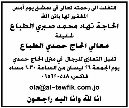 أخبار البلد- انتقلت إلى رحمة الله تعالى في دمشق يوم أمس، المغفور لها بإذن الله تعالى الحاجة نهاد محمد صبري الطباع، شقيقة معالي الحاج حمدي الطباع.