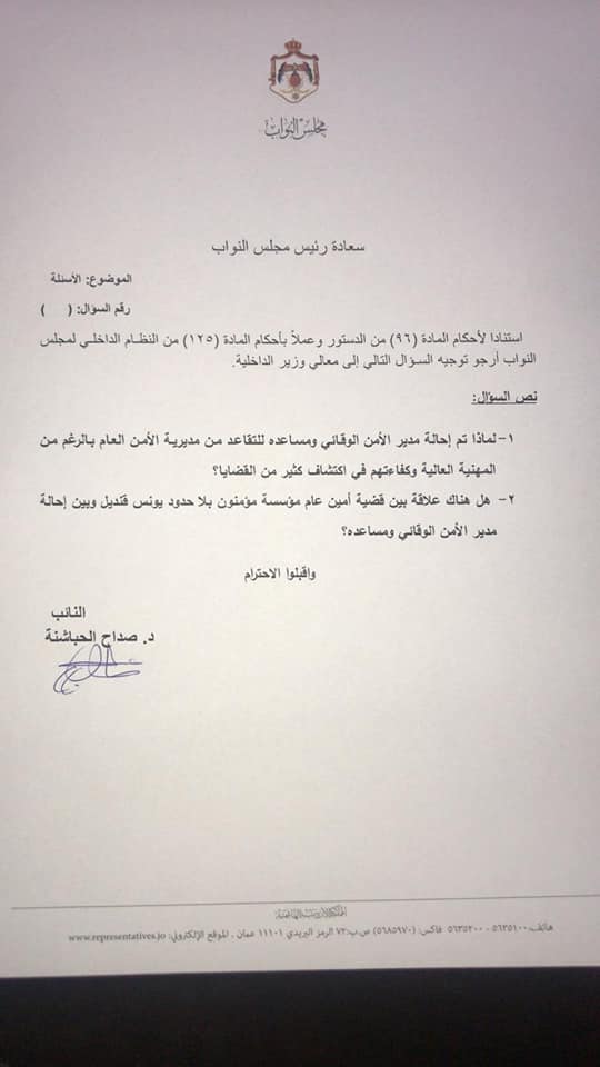 أخبار البلد - وجه النائب صداح الحباشنة سؤال نيابي لوزير الداخلية سمير المبيضين يستفسر عن أسباب احالة مدير الامن الوقائي طارق الهباهبة ومساعده سميح العجارمة للتقاعد من مديرية الأمن العام بالرغم من المهنية العالية وكفاءتهم في اكتشاف الكثير من القضايا.
