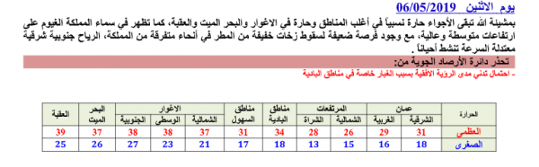 أخبار البلد - تكون الأجواء حارةً نسبيًا في أغلب مناطق المملكة وحارة في الأغوار والبحر الميت والعقبة، كما تظهر في سماء المملكة الغيومعلى ارتفاعات متوسطة وعالية.