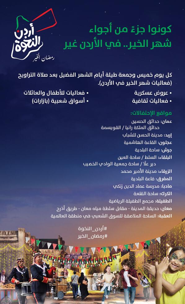 ويوفر البرنامج، الذي ينفذ يومي الخميس والجمعة من كلّ أسبوع طيلة شهر رمضان المبارك، أجواء عائلية تناسب الأسر الأردنية، في جميع محافظات المملكة، وذلك بعد صلاة التراويح، من خلال تنظيم البازارات الشعبية والأسواق، فضلاً عن تخصيص فقرات ترفيهية ومتنوعة للأطفال.