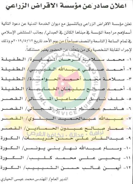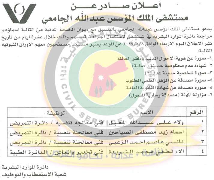 دعا ديوان الخدمة المدنية بالتعاون مع مختلف الوزارات والمؤسسات الحكومية، التالية اسماؤهم لاجراء المقابلات الشخصية وعقد الامتحان التنافسي لغايات التعيين.