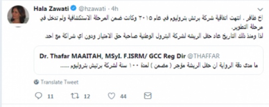 ردت وزيرة الطاقة والثروة المعدنية هالة زواتي على سؤال احد الاشخاص حول تأجيرحقل الريشة مدة 100 سنة لشركة برتش بتروليوم .