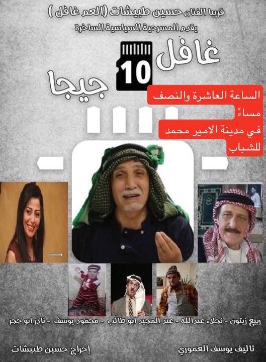ويشارك في المسرحية والتي تعرض مجاناً الفنانين (حسين طبيشات "العم غافل" ، ربيع زيتون ، نجلاء عبدالله ، عبد المجيد ابو طالب ، محمود يوسف ، نادر ابو حجر) ، وتأتي المسرحية من تأليف الكاتب يوسف العموري واخراج حسين طبيشات.