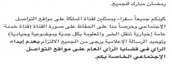 فالعديد استغرب من التعميم التي أُرسل لكافة العاملين في قناة المملكة والذي يؤكد على الجميع بعدم إبداء الرأي في قضايا الرأي العام على مواقع التواصل الاجتماعي الخاصة بهم، بحجة أن جميع العاملين سفراء وممثلين لقناة المملكة على مواقع التواصل الاجتماعي وحرصا من القناة على الحفاظ على صورتها بأنها قناة خدمية عامة إخبارية تنقل الخبر والمعلومة بكل جدية وموضوعية وحيادية.