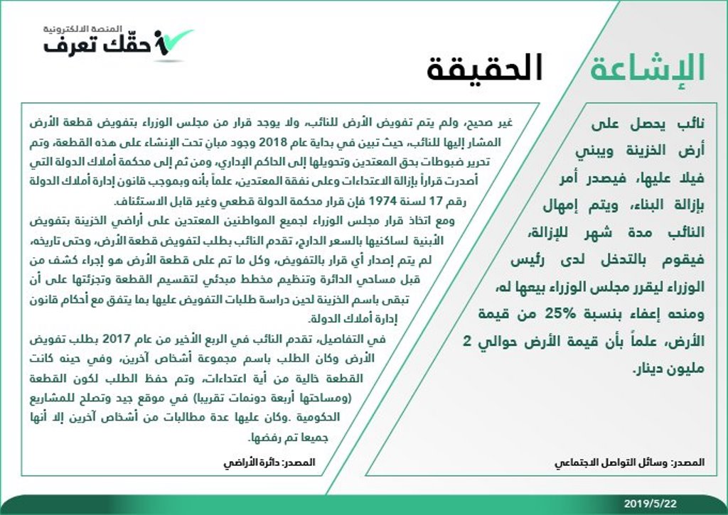 وأكدت الحكومة عبر منصة حقك تعرف ان تلك الأنباء لا صحة لها وانها لم تفوض أي أراض للنائب ولم يصدر عنها ذلك القرار ،مشيرة الى انه في عام 2018 تبين وجود مبان تحت الانشاء على هذه القطعة وتم تحرير ضبوطات بحق المعتدين وتحويلها الى الحاكم الاداري ومن ثم الى محكمة املاك الدولة، والتي بورها أصدرت قرارا بازالة الاعتداءات على نفقة المعتدين.