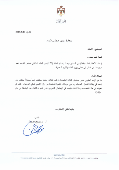 كشف النائب الدكتور مصلح الطراونة في سؤال نيابي موجه الى وزيرة الطاقة والثروة المعدنية عن استخدام مدير صندوق الطاقة المتجددة وترشيد الطاقة لاسم مستعار يختلف عن اسمه في بطاقة الاحوال المدنية.