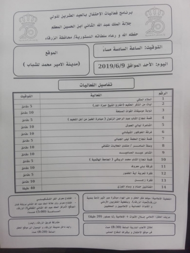 ويتضمن برنامج الحفل (14) فعالية تبدأ من السلام الملكي وتلاوة ايات من الذكر الحكيم يتولها نوبة موسيقات القوات المسلحة ثم عرض قصة نجاح الشاب عبد الرحمن الزغول ( مبادرة الخبز من اجل التعليم) .