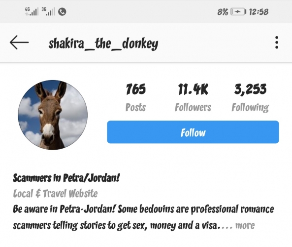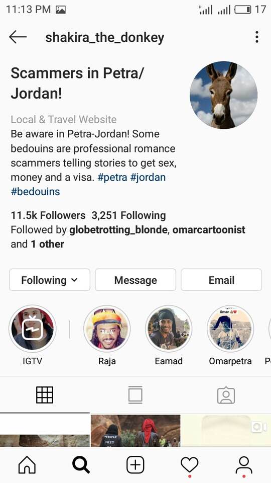 صفحةٌ على الانستقرام تحمل اسم المحتالون في البتراء، SCAMMERS IN PETRA، بالإضافة إلى وصفها بعض البدوين