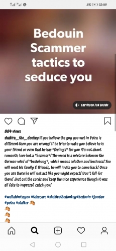 بأنهم محتالين ومحترفون في سرد القصص للحصول على الجنس والمال والتأشيرة، "BE AWARE IN PETRA-JORDAN!k SOME BEDOUINS ARE PROFESSIONAL ROMANCE