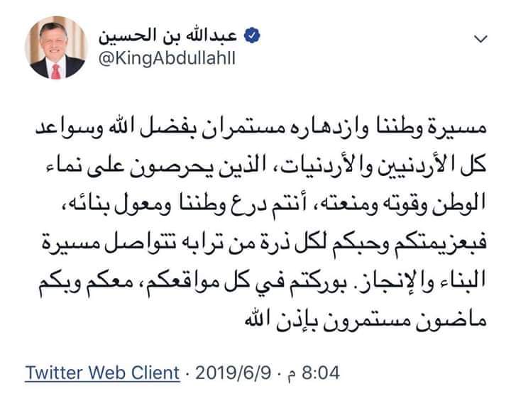 وغرّد الملك عبر حسابه على موقع تويتر، الأحد، قائلا "مسيرة وطننا وازدهاره مستمران بفضل الله وسواعد كل الأردنيين والأردنيات، الذين يحرصون على نماء الوطن وقوته ومنعته، أنتم درع وطننا ومعول بنائه، فبعزيمتكم وحبكم لكل ذرة من ترابه تتواصل مسيرة البناء والإنجاز. بوركتم في كل مواقعكم، معكم وبكم ماضون مستمرون بإذن الله".