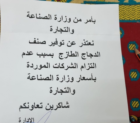 ما زال أصحاب الشركات الموردة للدجاج لا تلتزم بقرارات وزارة الصناعة والتجارة ، والعمل بالأسعار التي وضعتها وزارة الصناعة والتجارة للحد من التلاعب الذي كان يحدث خلال الفترة الماضية ..الحديث يطول حول هذه القضية حيث نرى الأسعار توضع حسب مصلحة الموردين دون الالتفات إلى مصلحة المستهلك أو حتى القرارات التي وضعتها الوزارة.