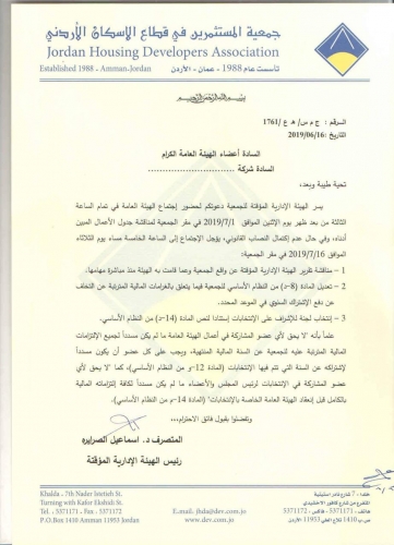 قررت الهيئة الإدارية المؤقتة لجمعية مستثمري قطاع الإسكان دعوة أعضاء الجمعية لحضور إجتماع الهيئة العامة للجمعية وذلك يوم الاثنين الموافق 1/7/2019 في مقر الجمعية.