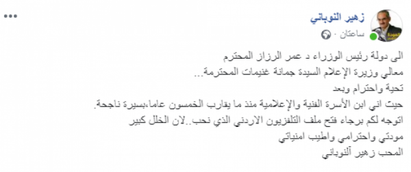وقال النوباني من خلال المنشور الذي كتبه عبر حسابه الشخصي على الفيس بوك : "أنا ابن الأسرة الفنية والإعلامية منذ ما يقارب الخمسون عاما، بسيرة ناجحة، اتوجه لكم برجاء فتح ملف التلفزيون الاردني الذي نحب..لان الخلل كبير".