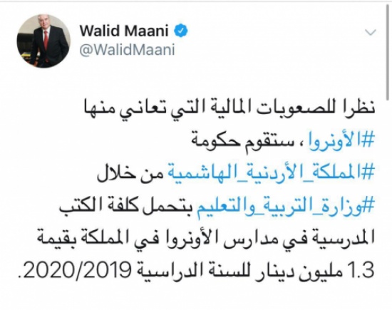 وقال في تغريد له الاربعاء : نظرا للصعوبات المالية التي تعانيها الاونرنوا ، فستقوم الحكومة ومن خلال الوزارة بتحمل كلفة الكتب المدرسية في مدارس الاونروا في المملكة بقيمة 1،3 مليون دينار للسنة الدراسية 2019- 2020 .