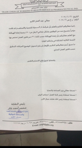 أخبار البلد - وجهت النقابة العامة للعاملين في الخدمات الصحية والصناعات الدوائية كتابا إلى وزير العمل فيما يخص بتسريح شركة الدواء للتنمية والاستثمار لعشرات الموظفين بشكل جماعي وبما لا يقل عن 70 موظف بحجة إعادة الهيكلة.
