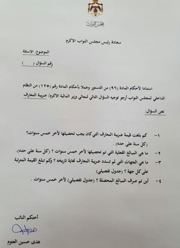 وتطرقت العتوم في سؤالها النيابي إلى قيمة ضريبة المعارف التي كان يجب تحصيلها وإلى المبالغ الفعلية التي تم تحصيلها ، إضافة إلى توضيح أوجه صرفها لآخر خمس سنوات مفصلة في كل سنة على حدة .