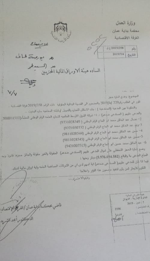 اصدر قاضي محكمة بداية عمان - الغرفة الاقتصادية د. امجد شريدة قراراً يقضي بوضع اشارة الحجز على الاموال المنقولة وغير المنقول لرجل الاعمال نضال عبدالخالق ابو الحاج واخوانه وليد ،وحسن،وحسين بالاضافة الى عبدالخالق محمد ابو الحاج بالطلب رقم 229/ط/2019 المضموم الى القضية البدائية الحقوقية ذات الرقم 358/2019 والتي رفعها احد البنوك المحلية ضد شركة الشرق الاوسط العالمية للتجارة وخمسة من اصحابها وهم المذكورين اعلاه
