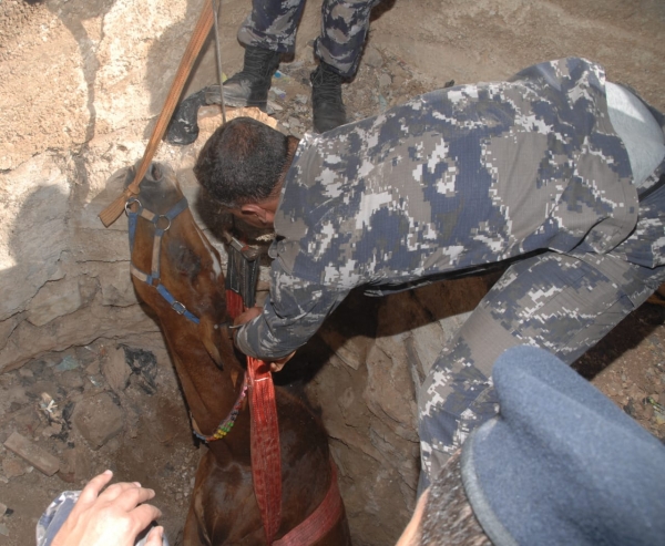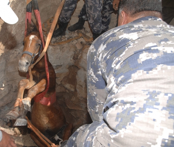اخبار البلد - تمكنت كوادر الإنقاذ في مديرية دفاع مدني شرق اربد من إنقاذ حصان سقط داخل حفرة يقدر عمقها بـ(2م) بمنطقة المغير.