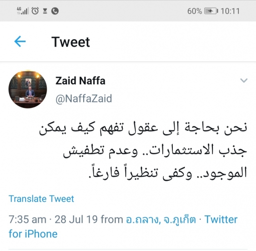 وقال نفاع في تغريدته :"نحن بحاجة إلى عقول تفهم كيف يمكن جذب الإستثمارات.. وعدم تطفيش الموجود.. وكفى تنظيراً فارغاً".