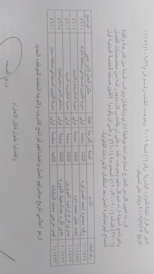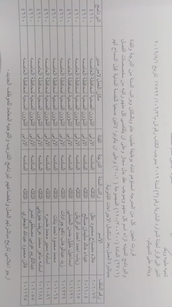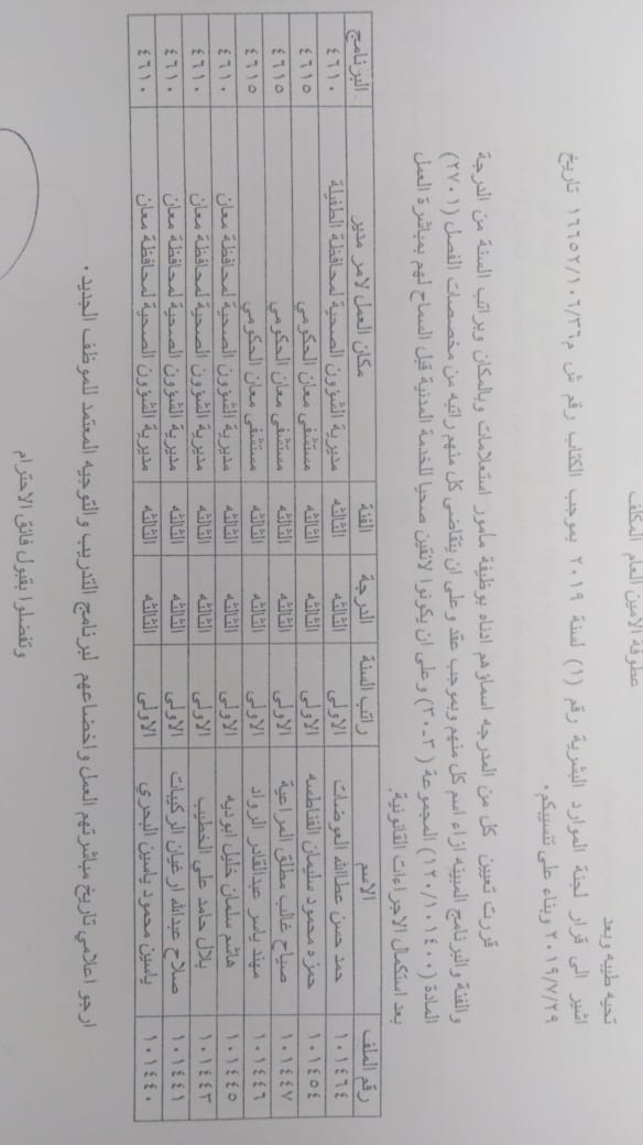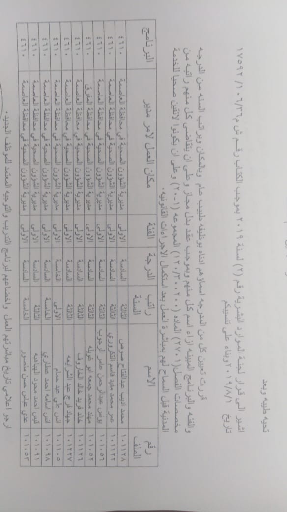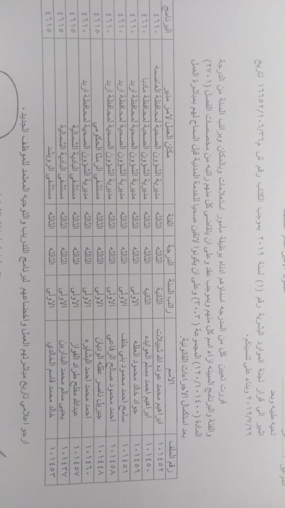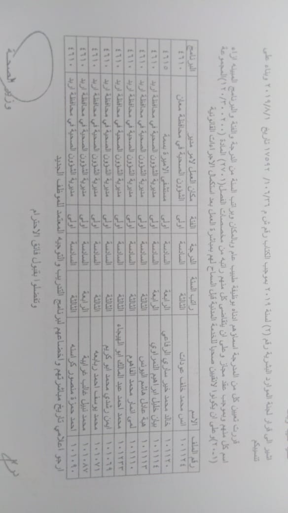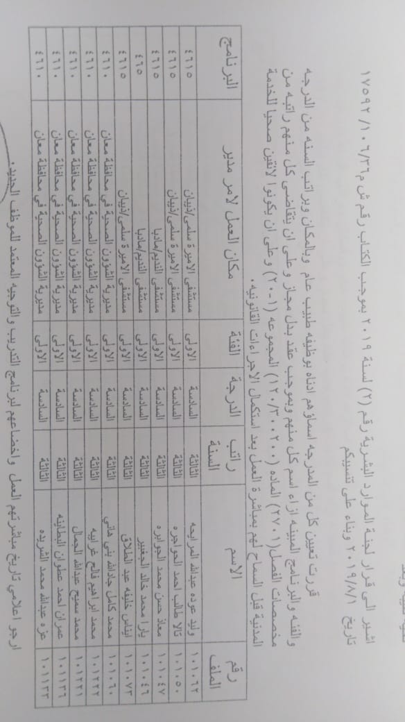 ودعت الوزارة الموظفين المدرجة اسماؤهم الالتحاق باماكن عملهم في مديريات الصحة وحسب الاسماء المرفقة في الكشف الذي سينشر على موقع وزارة الصحة الرسمي WWW.MOH.GOV.JO.