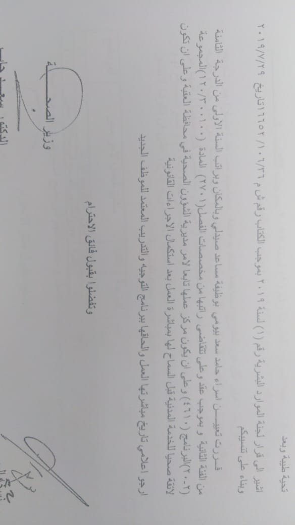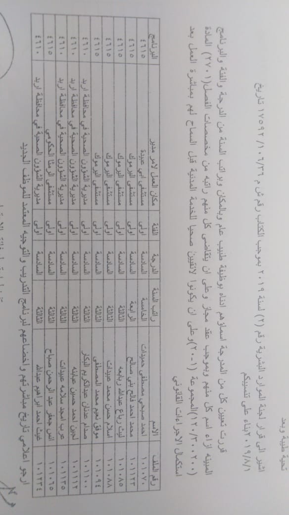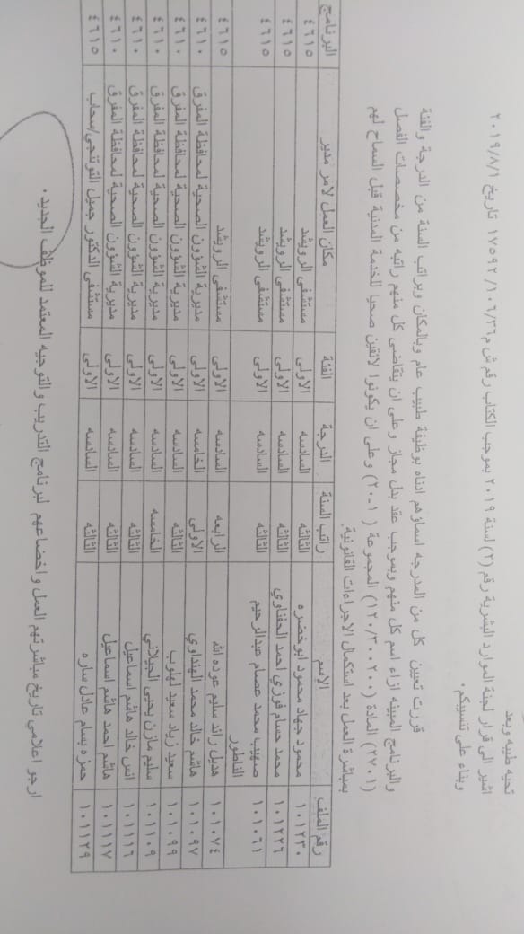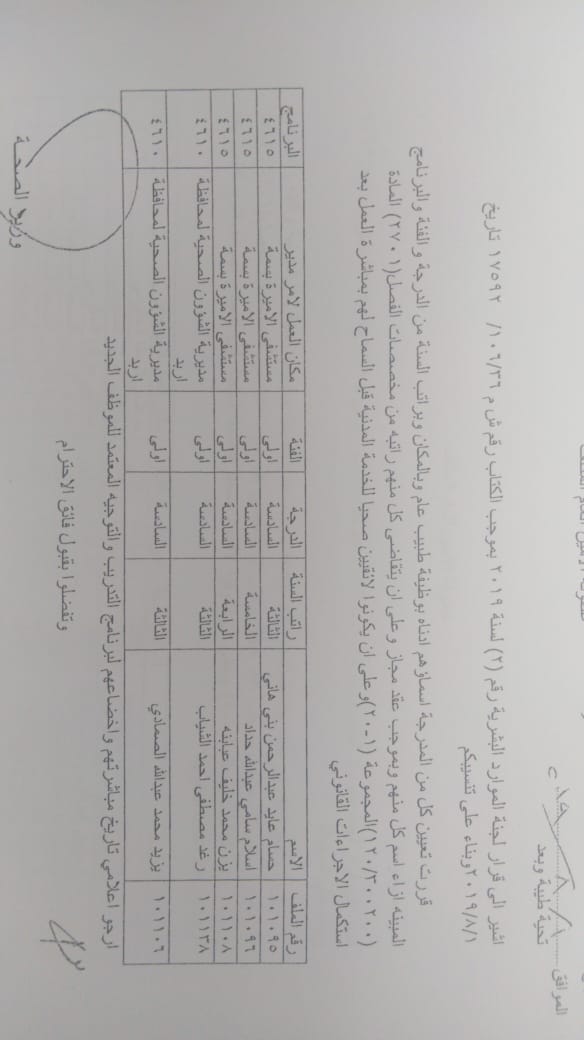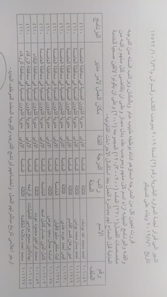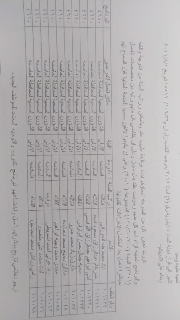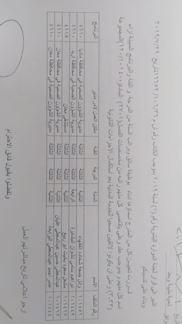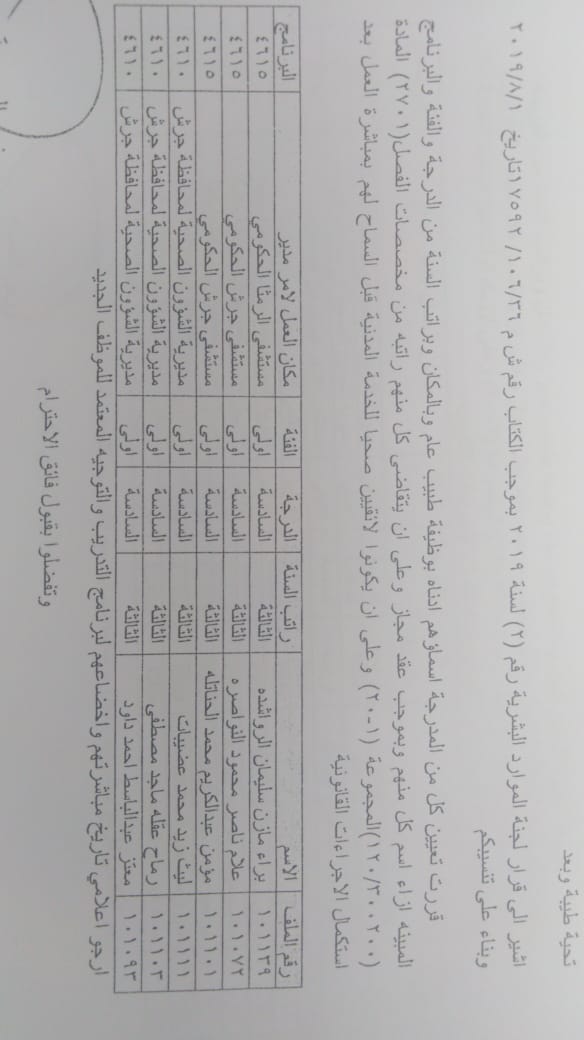 ودعت الوزارة الموظفين المدرجة اسماؤهم الالتحاق باماكن عملهم في مديريات الصحة وحسب الاسماء المرفقة في الكشف الذي سينشر على موقع وزارة الصحة الرسمي WWW.MOH.GOV.JO.
