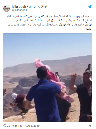 واضافت عودة عبر تغريدة في حسابها على تويتر نقلا عن الصحيفة "ان السلطات الأردنية تغلق قبر "أهارون كوهين " بمدينة البتراء، أمام السواح اليهود لقيامهم بأداء صلوات داخل القبر خلافاً للتعليمات".