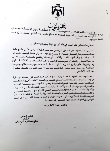 وطالب العرموطي من الحكومة بأخذ موقف حازم ،واغلاق هذه النوادي وتشديد الرقابة عليها وعلى مرتاديها نظراً لابتعادها عن قيم وأخلاق الأردنيين وعن خطر هذه الأماكن على المجتمع الأردني .