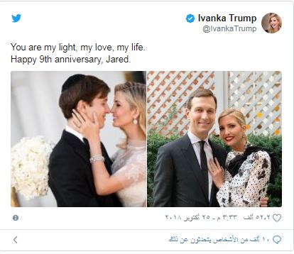 وتتبادل دوما إيفانكا وكوشنر صور رومانسية عديدة، كان أبرزها نشر إيفانكا عبر حسابها على "تويتر"، صورتين تجمعهما بزوجها في مناسبات مختلفة، وكتبت معها: "أنت نوري وحبي وحياتي، سنوية تاسعة سعيدة يا جاريد".