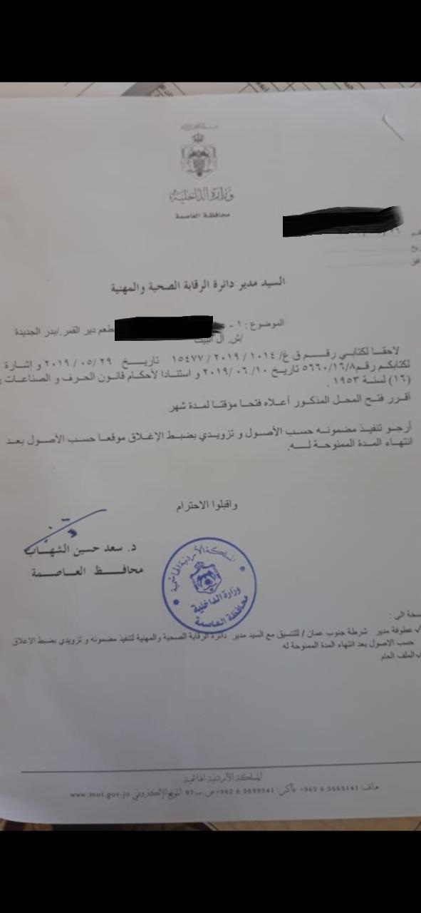 إلا أن المحافظ قام بإعطاء مهله للقائمين عليه لتصويب أوضاعهم المخالفه اصلا.. ويتهم أصحاب الأرض المحافظ وبسبب عدم إنفاذ القانون بالتسبب بخساره فادحه لأصحابها بعد اتفاقهم مع مستثمر عربي على شرائها بملايين الدنانير الا أن هذا المستثمر تراجع عن عمليه الشراء بعد أن اكتشف ان المطعم لا يزال قائما رغم قرارات الإغلاق والازاله والشمع الأحمر معتبرا أن هناك عجزا في تطبيق القانون وأنه في حال أتم عمليه البيع فإنه سيعاني الأمرين..