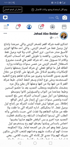 اثار الزميل جهاد ابو بيدر عبر صفحته على موقع التواصل الاجتماعي (فيس بوك) موضوع شركة القمر للصخر الزيتي .