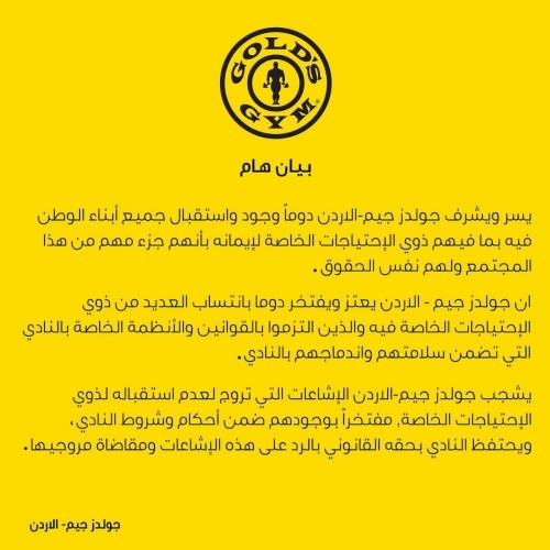 بعد تداول نشطاء عبر مواقع التواصل الاجتماعي عن شكاوى تتعلق بنادي "جولد جيم" في الأردن ، وحول رفضه لأشخاص من ذوي الاحتياجات الخاصة من الاشتراك في النادي ، وممارسة كافة حقوقهم المشروعة دون أية حواجز ... نشر ت إدارة النادي عبر صفحتها على "الفيسبوك" بيانا توضح فيه بأن النادي يتشرف دوما بوجود واستقبال جميع أبناء الوطن فيه بما فيهم ذوي الاحتياجات الخاصة لإيمانه بأنهم جزء مهم من هذا المجتمع ولهم نفس الحقوق.