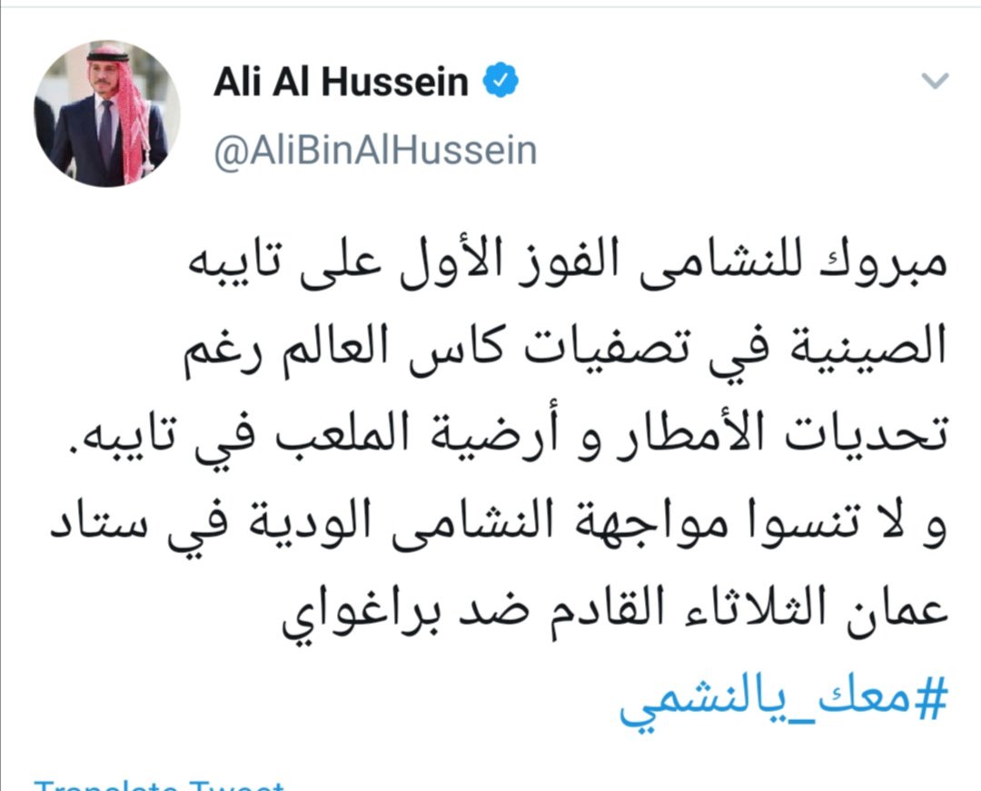 وطالب سموه بتغريده على "تويتر" تقديم الدعم والمؤازرة للنشامى في مباراته الودية القادمة أمام باراجواي ١٠ أيلول الجاري على ستاد عمان الدولي