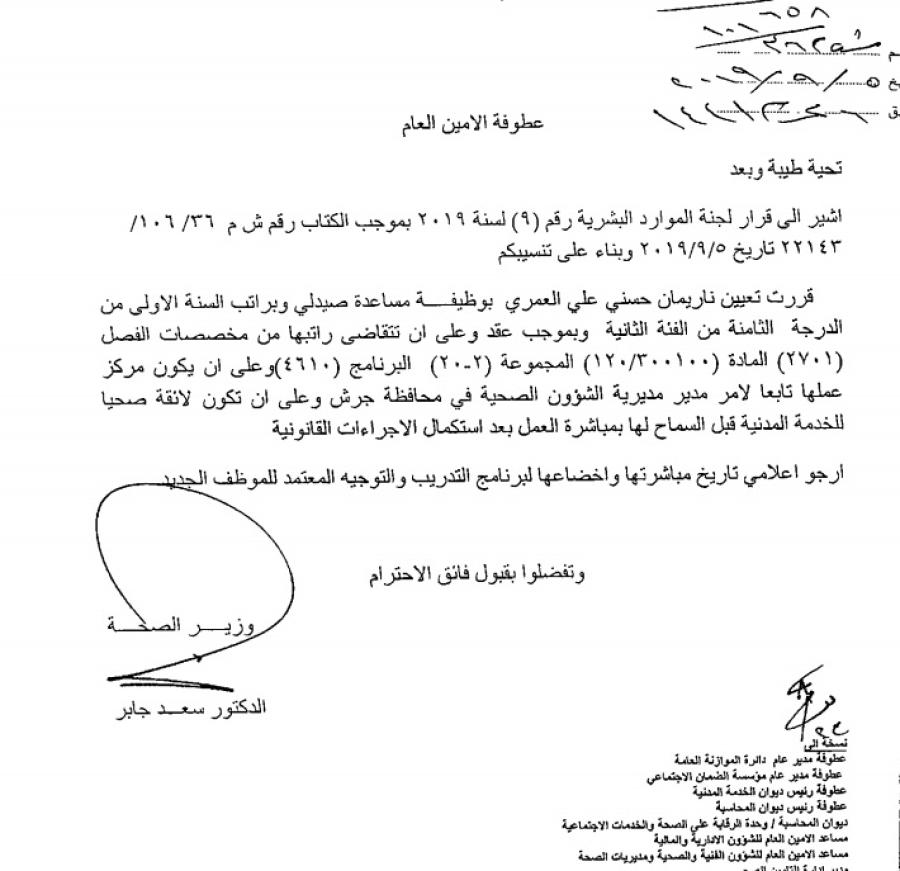 قرر وزير الصحة الدكتور سعد جابر تعيين عدد من الموظفين في ملاك وزارة الصحة وذلك بالتنسيق مع ديوان الخدمة المدنية.